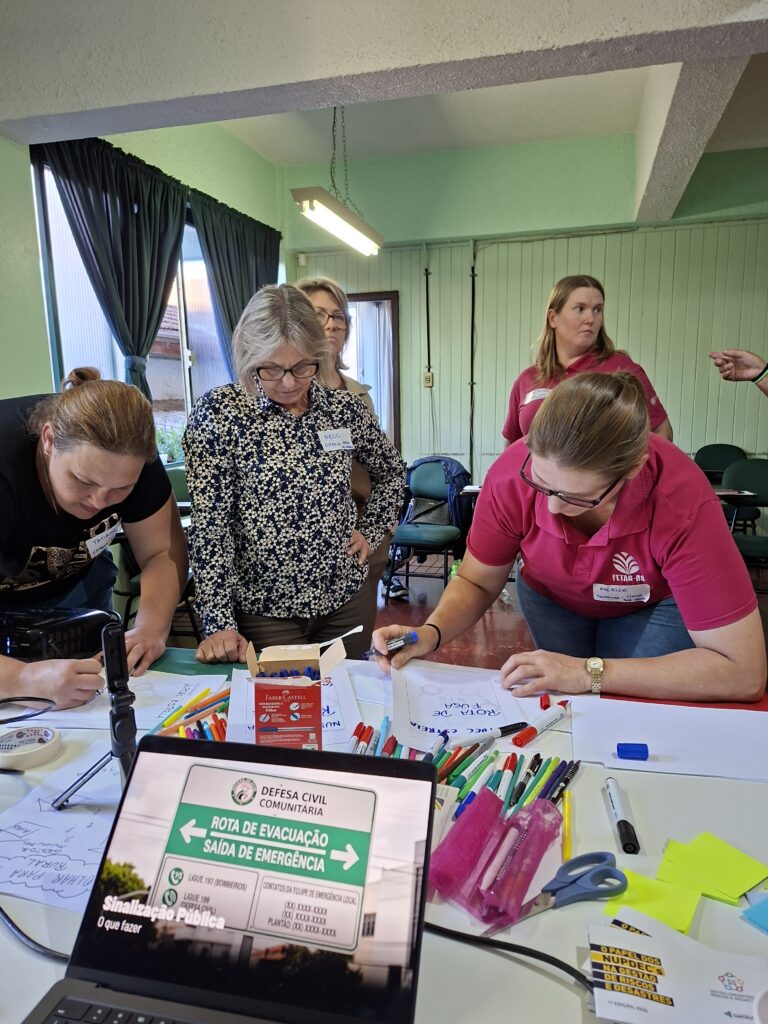 Cada encontro teve oito horas de duração e combinou rodas de conversa, dinâmicas coletivas e atividades práticas, criando um espaço de troca de experiências e construção de conhecimento. As participantes receberam um guia impresso sobre NUPDECs e materiais didáticos elaborados pela equipe da Fundação Gerações, em conjunto com a Hopeful – Escola de Desastres e a Defesa Civil de Santa Catarina.
